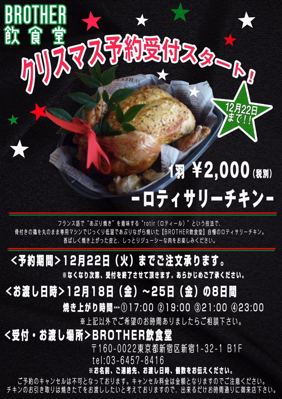 クリスマスイブも今夜も、クリスマス本番の明晩も、パッチワーク。は、新宿一丁目チキンの名店「ブラザー飲食堂」のロティサリーチキンをご用意の上、営業しております。